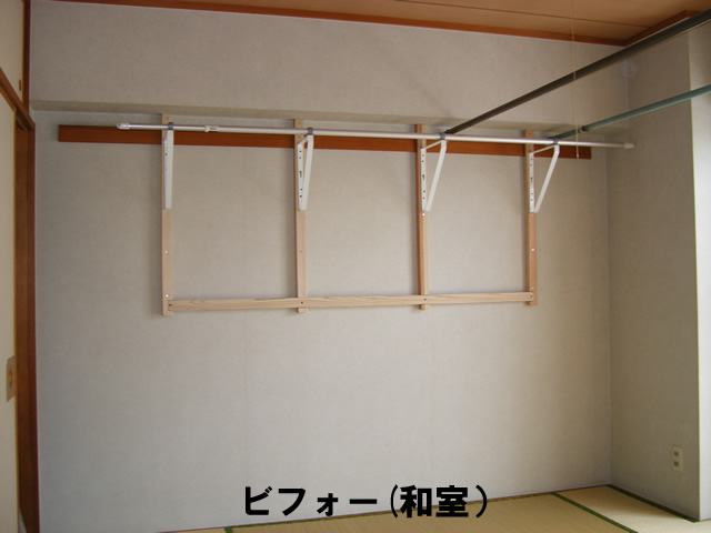 そこで和室の壁面にハンガーパイプ(実際は物干し竿)と吊り戸棚をつけ、洋服の長さ分がカーテンで隠れるようにしました。
